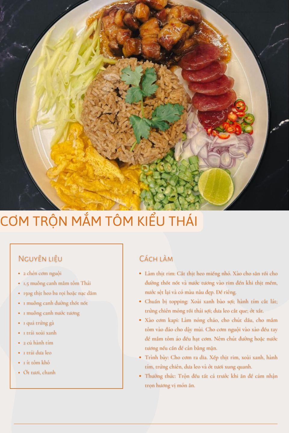 Với hương vị phong phú nhưng quen thuộc, Khao Kluk Kapi không chỉ đơn thuần là món cơm trộn mà nó là cả cách thưởng thức ẩm thực Thái theo phong cách bình dân mà tinh tế, mang đến trải nghiệm đầy màu sắc trong từng muỗng cơm.