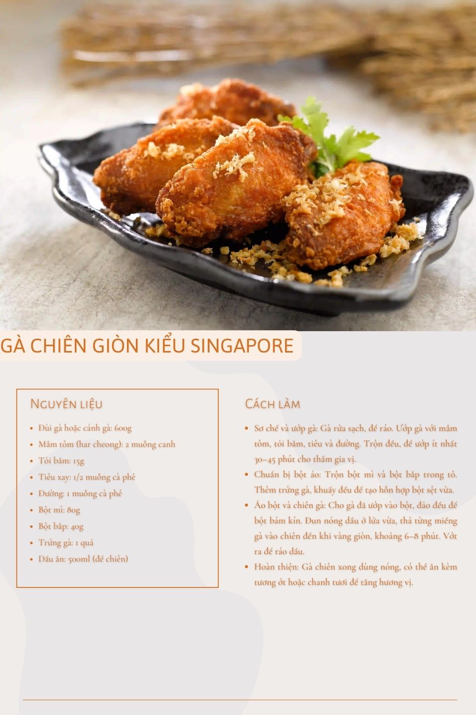 Với sự kết hợp giữa nguyên liệu quen thuộc và cách chế biến tinh giản, gà chiên giòn kiểu Singapore không chỉ là món ăn chơi mà còn trở thành món mặn trong bữa cơm. Hương vị mặn mòi của mắm tôm, vị béo nhẹ của lớp bột chiên và độ ngọt tự nhiên của thịt gà hòa quyện tạo nên món ăn ẩm thực quốc tế nhưng vẫn gần gũi.