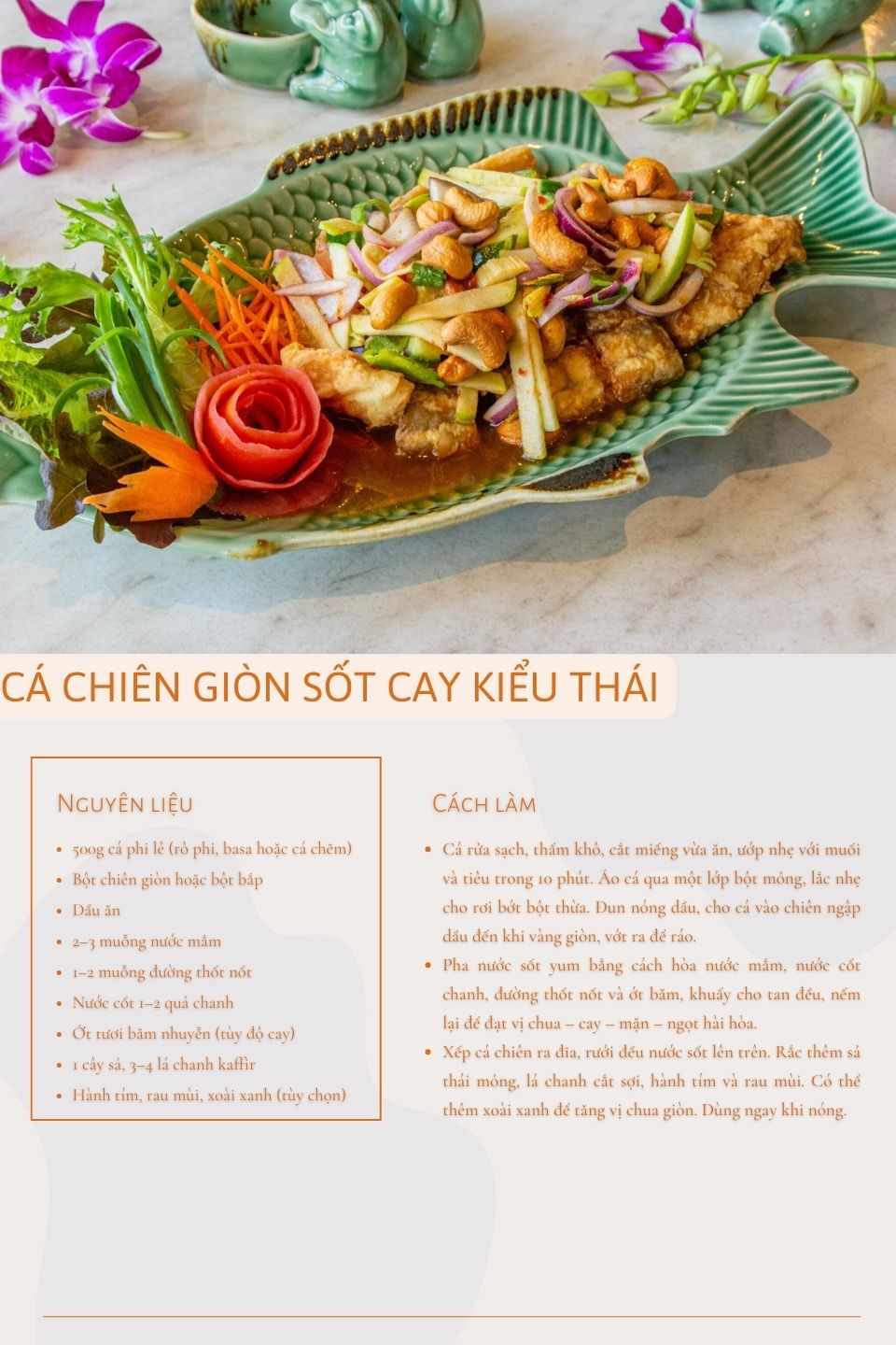 Đi cùng cá và sốt là các loại rau gia vị quen thuộc của ẩm thực Thái như hành tím, sả xắt mỏng, lá chanh kaffir, rau mùi và đôi khi có thêm xoài xanh bào sợi hoặc hành phi. Những nguyên liệu này không chỉ làm món ăn thêm bắt mắt mà còn góp phần cân bằng vị giác, như sả và lá chanh tạo mùi thơm tươi mát, hành tím giúp giảm độ ngấy, còn rau mùi làm hậu vị trở nên dễ chịu.