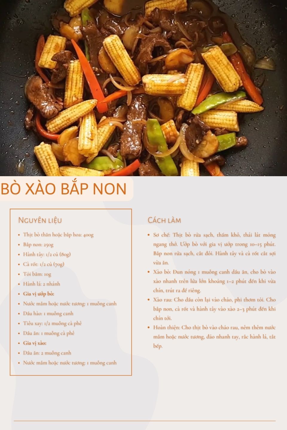 Thành phẩm là đĩa bò xào bắp non có màu nâu nhẹ của thịt bò xen lẫn sắc vàng nhạt của bắp non và màu xanh, cam của rau củ. Món ăn dùng nóng cùng cơm trắng là hợp nhất, có thể ăn kèm canh thanh nhẹ hoặc rau luộc để cân vị. Với hương vị quen thuộc, dễ ăn và cách chế biến nhanh gọn, bò xào bắp non luôn là lựa chọn cho bữa cơm gia đình hay những bữa trưa bận rộn.