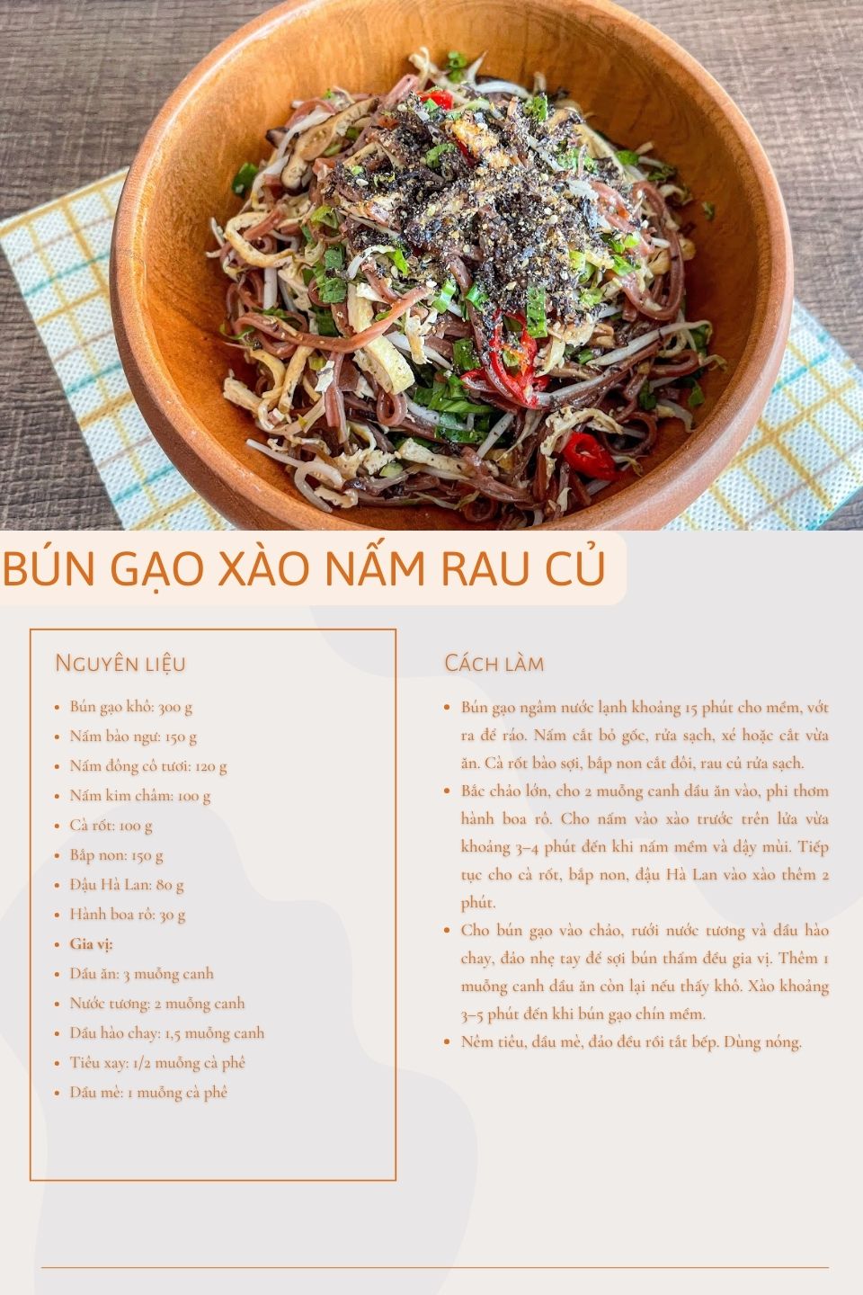 Khi chế biến, thứ tự xào là yếu tố quan trọng. Nấm và rau củ được xào trước để chín đều và dậy mùi, sau đó mới cho bún gạo vào đảo nhẹ tay. Nhờ vậy, sợi bún không bị gãy nát, các nguyên liệu quyện đều mà vẫn giữ hình thức đẹp mắt. Món ăn hoàn thiện có màu sắc hài hòa, mùi thơm dịu, nhìn đơn giản nhưng rất cuốn.