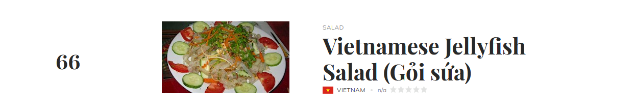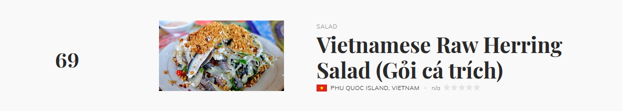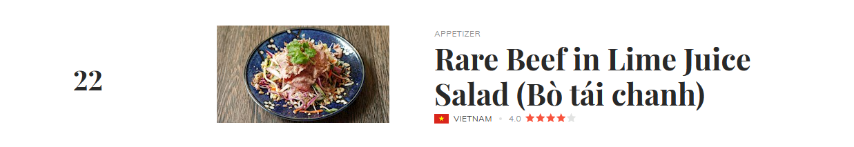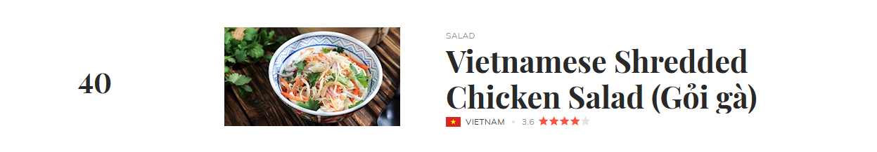 Theo đó, bò tái chanh xếp ở vị trí 22 với 4.0 điểm sao đánh giá. Còn lại, lần lượt là gỏi gà (40), gỏi sứa (66) và gỏi cá trích (69). Điểm chung của những món ăn vừa kể là sử dụng các loại rau củ thân quen trong gian bếp, cùng nước chấm, nước trộn gỏi mang phong vị ẩm thực Việt. Đứng đầu danh sách là pecel, một món gỏi của người dân Indonesia với sốt làm từ đậu phộng.