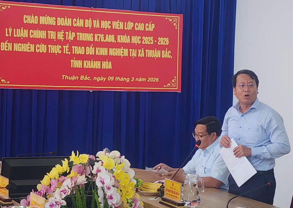 Ngày 9-3-2026, đoàn cán bộ và học viên Lớp Cao cấp chính trị K76.A06, Học viện Chính trị Khu vực II đã đến xã Thuận Bắc, Khánh Hoà, nghiên cứu thực tế và tìm hiểu về tình hình chính quyền cấp xã sau sáp nhập và thực hiện chính quyền địa phương 2 cấp. Đoàn đã làm việc cùng Đảng ủy, UBND xã Thuận Bắc, sau đó trao tặng 38 suất học bổng "Tiếp bước đến trường" trị giá 38 triệu đồng cho học sinh Trường PTDT Nội trú THCS Thuận Bắc.