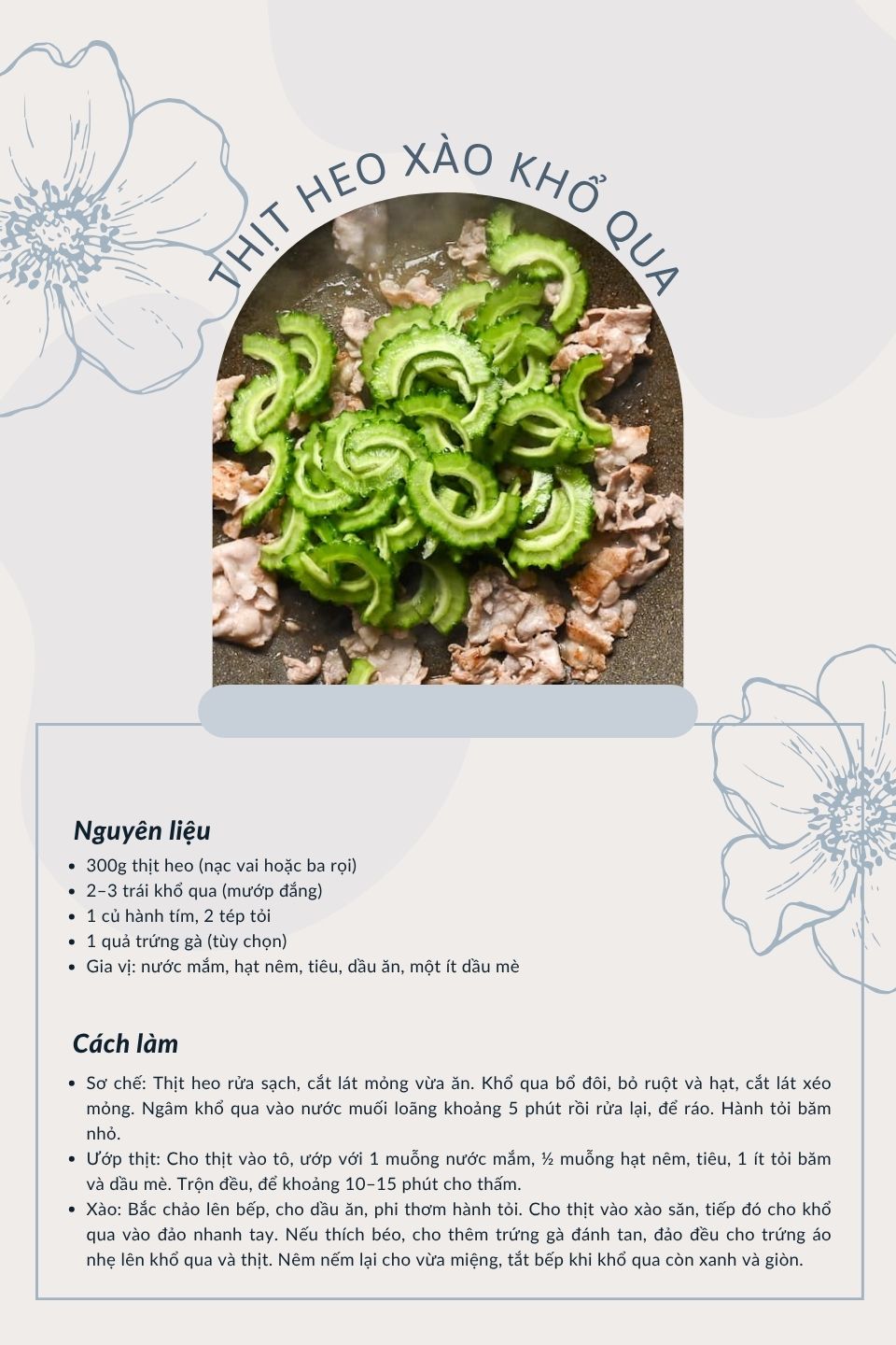 Bữa cơm trưa có đĩa thịt heo xào khổ qua nóng hổi, thêm chén nước mắm ớt tỏi và chén cơm trắng dẻo thơm, là đủ cho một bữa ăn trọn vị. Món ăn không chỉ giúp giải nhiệt, mà theo dân gian, còn có tác dụng thanh lọc cơ thể và kích thích tiêu hóa.