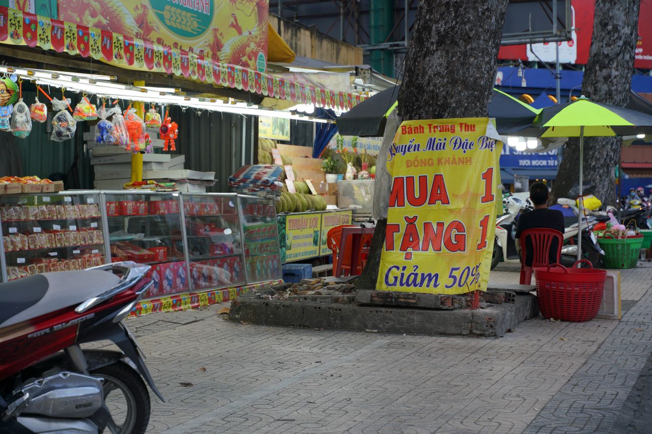 Các gian hàng trên đường Nguyễn Tri Phương vắng vẻ chiều ngày 5-10 (tức 14 tháng Tám âm lịch).Tương tự, các gian hàng bánh Trung thu ở các tuyến đường đông người qua lại như Hồng Bàng, Nguyễn Biểu, Lạc Long Quân, Lý Thái Tổ, Quang Trung... cũng đìu hiu.Nhiều cửa hàng treo biển khuyến mãi dày đặc, giảm giá đến 49%, mua 1 tặng 1, chiết khấu cho khách mua số lượng lớn hay tặng lồng đèn, sức mua vẫn không cải thiện.Chị Kim Ngọc (bìa trái), nhân viên một điểm bán bánh Trung thu trên đường Hồng Bàng, cho biết “Thông thường những ngày sát Trung thu, lượng khách rất đông. Nhưng năm nay khách đến rất ít, sức mua tại gian hàng năm nay đã giảm 35–40% so với năm trước”.Một số khách hàng tranh thủ cuối ngày đến mua bánh Trung thu.Tại gian hàng gần chợ Hồ Thị Kỷ, anh Lê Trương Hữu Huy, quản lý, cho biết ngày cuối bán lượng khách đến đông gấp 4–5 lần so với trước, nhưng nhiều người chỉ tham khảo mà không mua. Năm nay sức mua chậm, khách ưa chuộng bánh Như Lan và Kinh Đô nhất, cũng là những thương hiệu đã có lâu đời.Theo ghi nhận của phóng viên, ngày cuối trước rằm tháng Tám, giá bánh Trung thu có giá từ 35.000 đồng - 70.000 đồng.Gian hàng trên đường Ba Tháng Hai sáng đèn, nhưng rất ít khách đến.