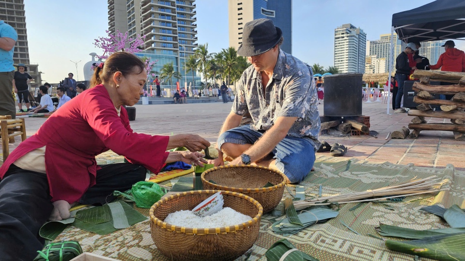 Du khách hào hứng trải nghiệm gói bánh chưng, đập niêu, nhảy sạp bên bờ biển Đà Nẵng