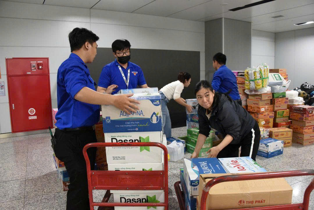 Nhà Văn hóa Thanh niên TPHCM cũng là một trong những điểm nhận hàng cứu trợ trên địa bàn thành phố. Trong ngày 22-11, dòng người mang theo mì gói, nước suối, quần áo và các vật dụng cá nhân liên tục đổ về.