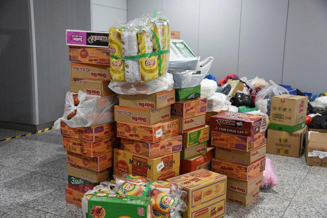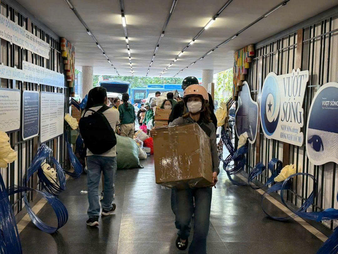 Nhân viên, tình nguyện viên tại nhà ga của tuyến metro số 1 liên tục tiếp nhận hàng hóa cứu trợ. Người dân có thể mang quần áo, đồ dùng thiết yếu đến gửi từ 5 giờ đến 22 giờ các ngày trong tuần và đến 23 giờ vào thứ Bảy, Chủ nhật.
