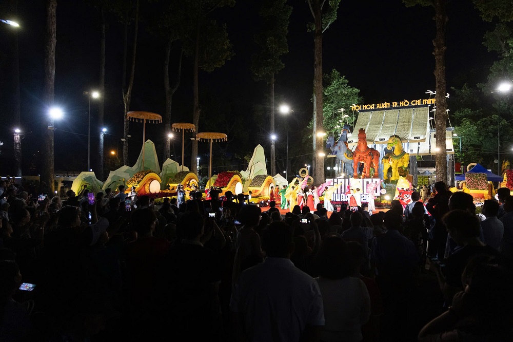 (SGTT) - Tối 12-2, tức 25 tháng Chạp năm Ất Tỵ, hội hoa xuân TPHCM lần thứ 46 khai mạc tại Công viên Tao Đàn và bắt đầu đón khách. Năm nay lễ hội bổ sung chương trình diễu hành, trình diễn nghệ thuật hằng đêm, kéo dài đến hết ngày 22-2, hứa hẹn tạo thêm điểm nhấn cho mùa du xuân trung tâm thành phố.