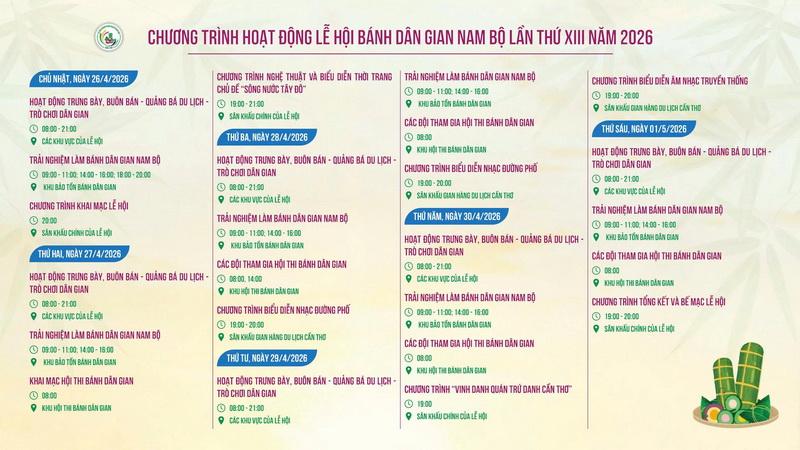 (SGTT) - Lễ hội Bánh dân gian Nam Bộ lần thứ 13 năm 2026 sẽ diễn ra trong 6 ngày, từ 26-4 đến 1-5-2026 tại Quảng trường phường Bình Thủy, thành phố Cần Thơ.
