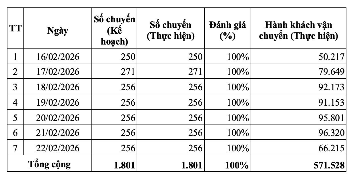 Tổng số chuyến tàu là 1.801 chuyến, đạt 100% kế hoạch và tăng 39% so với cùng kỳ năm trước. Kết quả này cho thấy nhu cầu sử dụng vận tải công cộng của người dân tăng cao trong dịp cao điểm Tết.