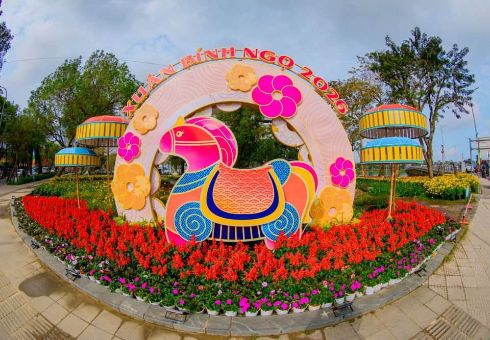Cụm linh vật ngựa đối xứng hai bên tại công viên Thương Bạc, bên bờ Bắc sông Hương, TP. Huế.Từ bên trong lầu Thương Bạc nhìn ra, hình ảnh chú ngựa vươn mình giữa thảm hoa rực rỡ và dòng sông Hương phẳng lặng, mang cảm giác thanh bình, khoan thai.Ngựa xuân tung vó trên nền mây nước cách điệu, nổi bật giữa sắc hoa vàng đỏ – một điểm nhấn sinh động, gửi gắm ước vọng hanh thông, bình an cho năm mới.Linh vật ngựa Bính Ngọ nổi bật giữa không gian cổ kính bên bờ sông Hương, thu hút người dân dừng chân ghi lại những tấm hình lưu niệm.Hình tượng chú ngựa “mũm mĩm” đầu cầu Phú Xuân, xung quanh là thảm hoa bắt mắt.Song mã tại đài phun nước (trước UBND thành phố Huế) với bố cục đối xứng, một đỏ một xanh lam, vươn mình giữa thảm hoa rực rỡ, tạo nên khung cảnh vừa sinh động vừa hài hòa.Cận cảnh song mã cho thấy những đường nét cách điệu tinh tế, hoa văn truyền thống được xử lý mềm mại, làm nổi bật vẻ đẹp vừa hiện đại vừa rất Huế.Hình tượng tam mã trước Bia Quốc học đang gấp rút được hoàn thiện, từng dáng ngựa nối tiếp nhau tạo cảm giác chuyển động liền mạch, như một hành trình vượt lên đầy sinh khí giữa không gian Tết Huế.Nhìn từ góc rộng, tam mã nổi bật giữa nền trời vừa mạnh mẽ vừa hài hòa, mang tinh thần hanh thông của năm mới đến với mọi người.