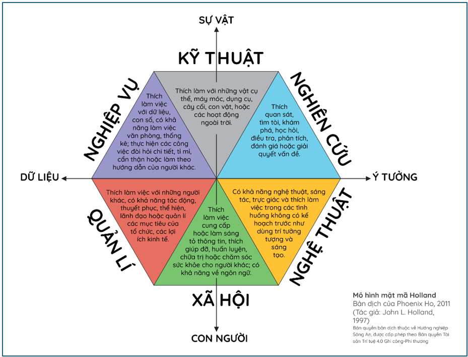 Holland Code chia thiên hướng nghề nghiệp thành sáu nhóm: kỹ thuật, nghiên cứu, nghệ thuật, xã hội, quản lý và nghiệp vụ. Chúng ta thường có hai hoặc ba nhóm Holland thế mạnh. Các nhóm này sẽ giúp người đó dễ dàng phát triển theo những thiên hướng nghề nhất định. Tất nhiên, tài năng và sự học hỏi bền bỉ có thể giúp chúng ta học nhanh và làm được nhiều nghề khác nhau (như gần đây vô số người lao vào học và làm AI), nhưng các nhóm thiên hướng Holland thế mạnh sẽ giúp chúng ta làm nghề này thuận lợi hơn nghề khác.