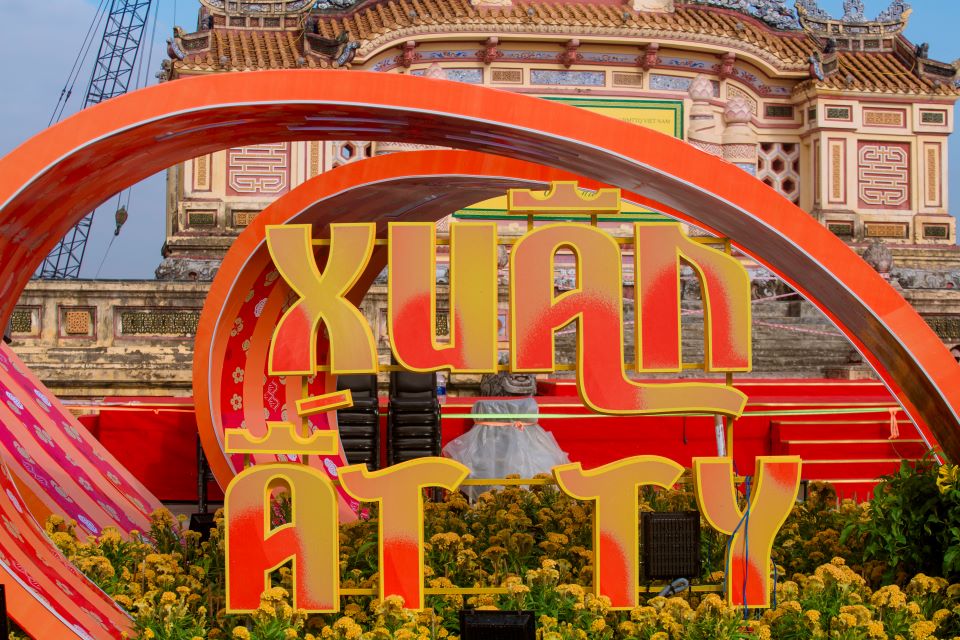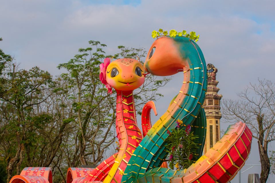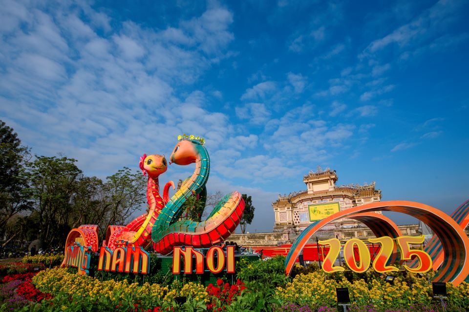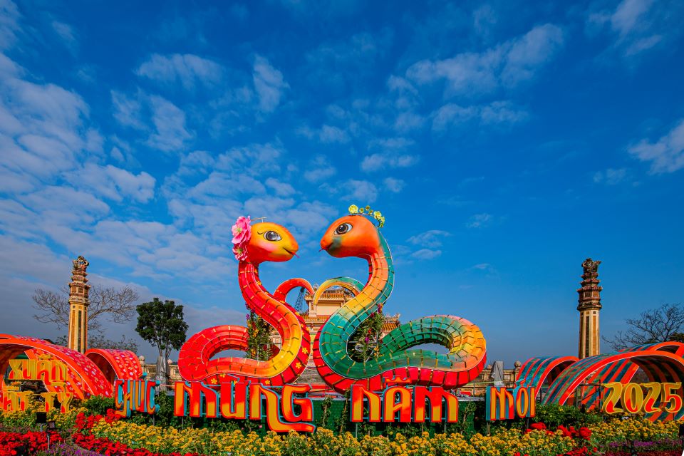 Năm nay, cặp linh vật rắn được thiết kế với chiều dài 30 mét, tương đương linh vật rồng năm 2024, và được đặt tại quảng trường Bia Quốc Học trên đường Lê Lợi. Ảnh: Xuân ĐạtLinh vật rắn được tạo hình dựa trên cảm hứng từ hình tượng “Nhiêm xà”, hay còn gọi là Mai cảnh xà... Ảnh: Xuân Đạt...hình tượng này được chạm khắc trên Anh đỉnh, chiếc đỉnh đồng thứ ba trong bộ Cửu đỉnh Huế – Di sản tư liệu thế giới được UNESCO công nhận vào năm 2024. Ảnh: Xuân ĐạtCặp linh vật rắn được làm bằng khung thép đảm bảo cố định chắc chắn. Ảnh: Xuân ĐạtNgoài ra, các bộ phận khác được thiết kế mềm mại, hài hòa. Ảnh: Xuân ĐạtLinh vật này xuất hiện theo đôi, vừa mang lại cảm giác thân thiện vừa tạo sự hoành tráng, được tô điểm bằng họa tiết và màu sắc đặc trưng của Huế. Ảnh: Xuân ĐạtCông nhân môi trường đô thị tưới nước nhằm giữ cho hoa trưng bày được tươi; qua đó tạo nên điểm nhấn rực rỡ cho cặp linh vật rắn. Ảnh: Xuân ĐạtNhững chữ được cắt dán thanh thoát bài trí xung quanh cặp linh vật rắn… Ảnh: Xuân Đạt… cùng với đó rất nhiều chậu hoa, tiểu cảnh phụ trợ. Ảnh: Xuân ĐạtSau khi hoàn thiện, rất đông người dân và du khách đã ghé đến check-in cặp linh vật rắn… Ảnh: Xuân Đạt...và lưu lại hình ảnh của linh vật năm nay. Ảnh: Xuân ĐạtCặp linh vật rắn là điểm check-in, chụp hình lưu niệm và tham quan lý tưởng dành cho người dân và du khách. Ảnh: Xuân Đạt
