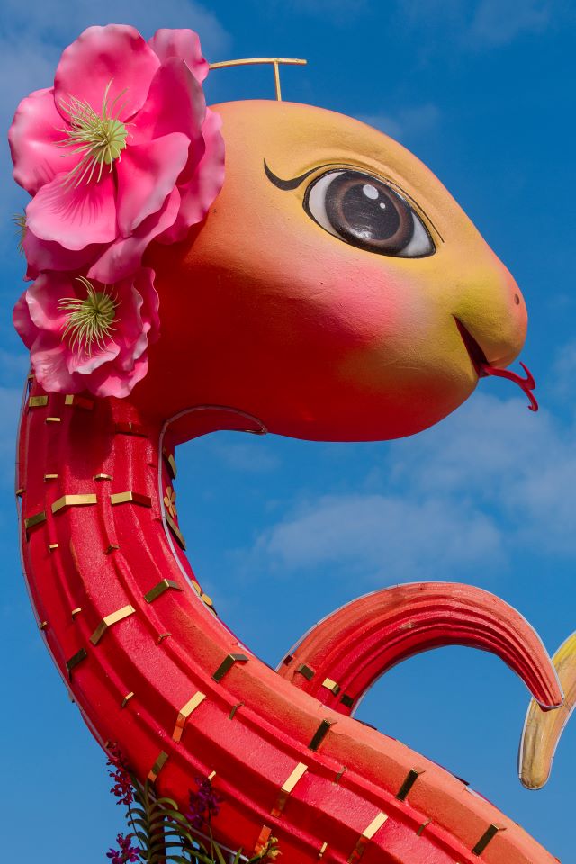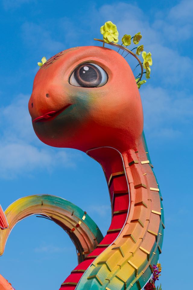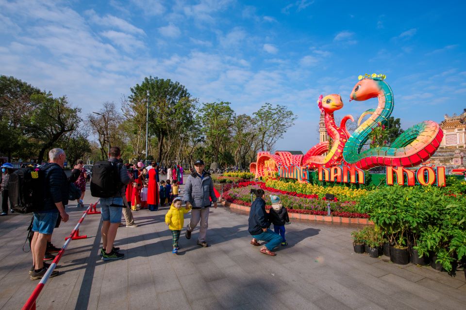 (SGTT) - Linh vật rắn Tết Nguyên đán Ất Tỵ tại thành phố Huế đã được hoàn thiện và đặt tại khu vực trước quảng trường Bia Quốc Học, thu hút đông đảo người dân, du khách đến check-in, chiêm ngưỡng ngay trong ngày đầu ra mắt.