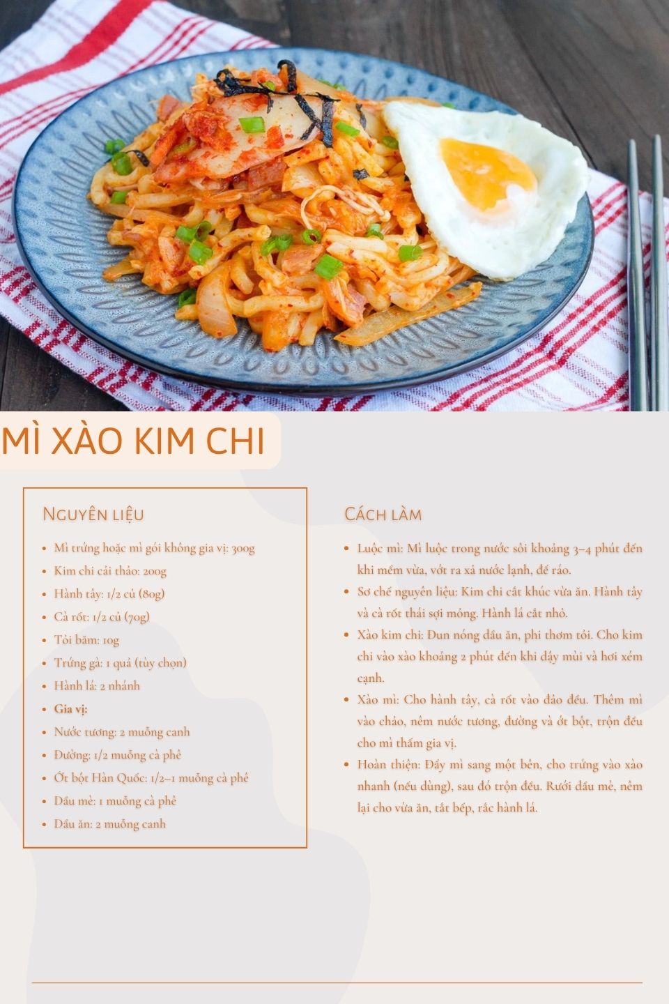 Thành phẩm là đĩa mì xào có màu đỏ cam hấp dẫn, sợi mì bóng nhẹ, kim chi xen kẽ đều. Món ăn dùng nóng là ngon nhất, có thể rắc thêm mè rang hoặc hành lá để tăng mùi thơm. Mì xào kim chi phù hợp cho bữa trưa nhanh gọn hoặc những ngày muốn đổi vị khỏi các món mì quen thuộc.
