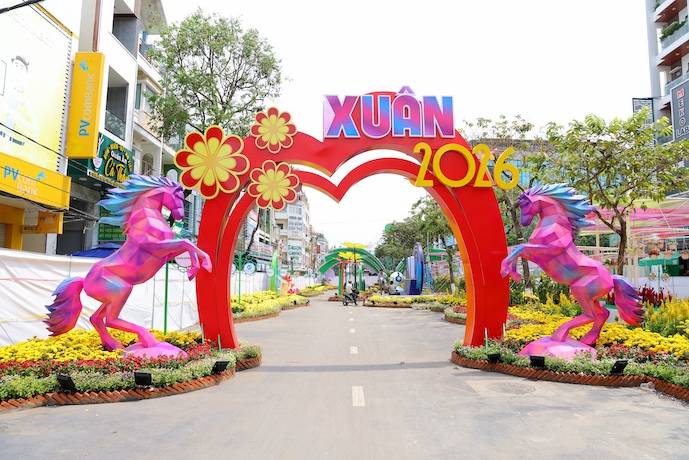 (SGTT) - Cần Thơ khai mạc đường hoa nghệ thuật Xuân Bính Ngọ 2026 trên đường Võ Văn Tần - Nguyễn Thái Học, phường Ninh Kiều vào tối 14-2 (nhằm 27 tháng Chạp). Điểm đặc sắc của đường hoa năm nay là sự xuất hiện của hai chú ngựa công nghệ.