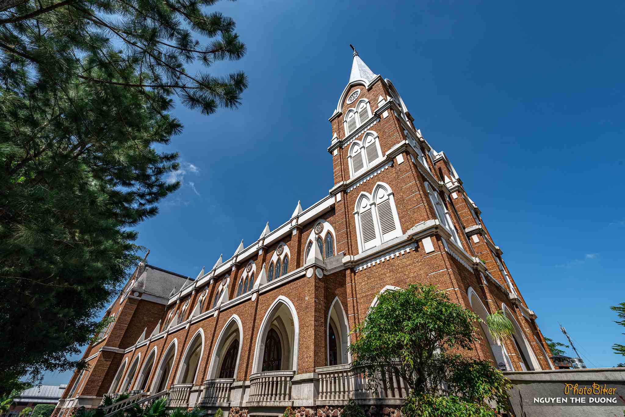 Hai tháp chuông cao vút, khối nhà thờ bằng đá ong đỏ nâu cùng những ô cửa chóp nhọn là đặc trưng của kiến trúc Pháp – vừa cổ điển, vừa gần gũi với thiên nhiên. Ảnh: Nguyễn Thế Dương