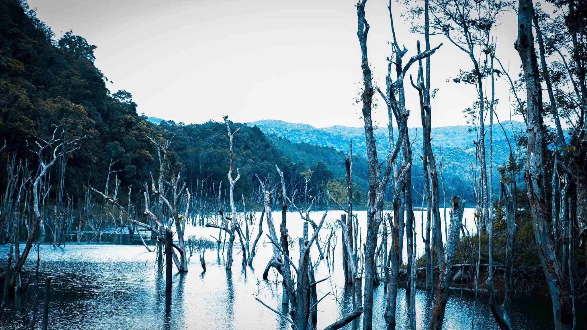 Trong quá trình tích nước nhiều năm, một phần cây cối ven bờ hồ bị ngập nước, chết dần và chuyển sang màu trắng ngà. Ảnh: Tố Đen