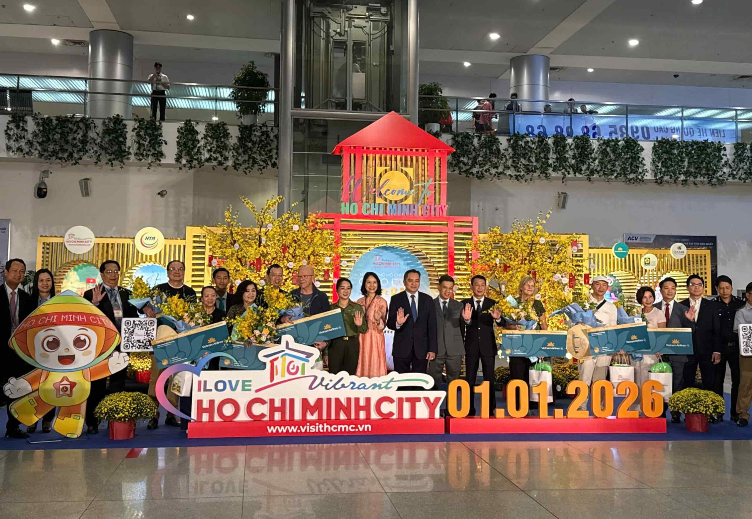 Tại sân bay Tân Sơn Nhất, những vị khách đầu tiên của năm mới còn được tận hưởng không khí Tết cổ truyền với tiểu cảnh chợ Bến Thành, hoa mai vàng, hoa cúc rực rỡ cùng cụm chữ “I Love Vibrant HCMC”.