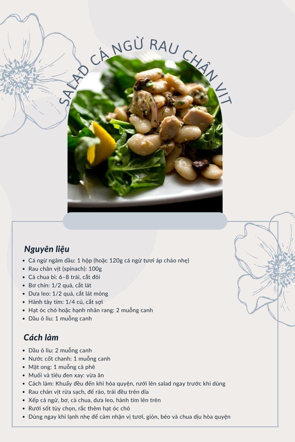 Một đĩa salad cá ngừ rau chân vịt không chỉ mang lại bữa ăn ngon miệng mà còn là nguồn năng lượng xanh cho bữa trưa lành mạnh, nhẹ nhàng, thanh mát nhưng vẫn dinh dưỡng.