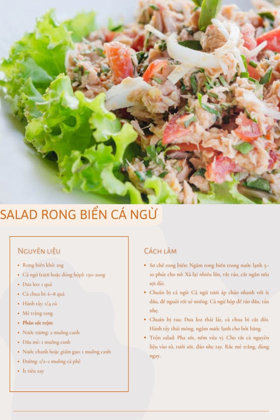Với sự thanh mát, dễ ăn và hình thức trình bày gọn gàng, salad rong biển cá ngừ là lựa chọn phù hợp cho những ngày muốn đổi vị, ăn nhẹ nhưng vẫn đảm bảo đủ chất và ngon miệng.