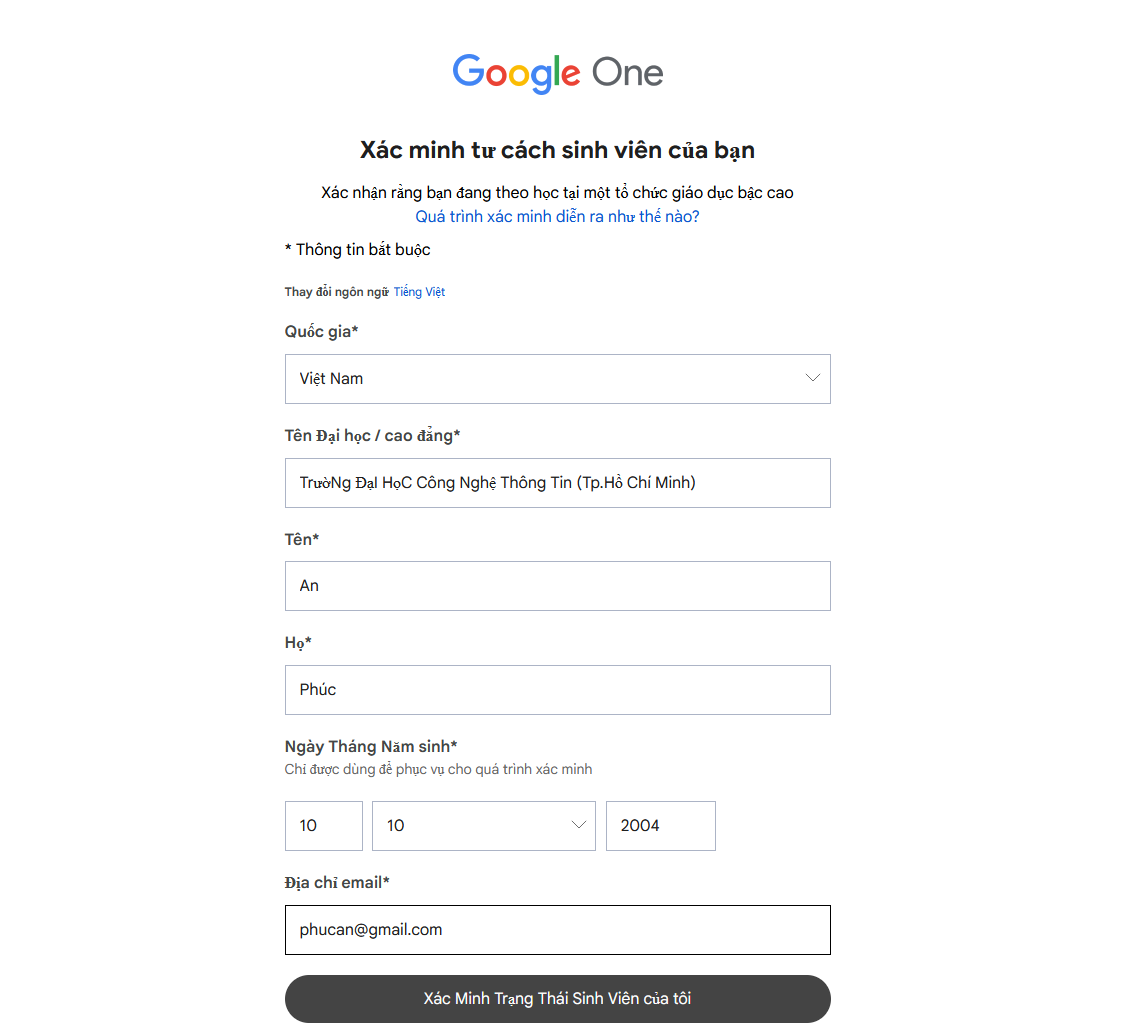 Đầu tiên, người dùng truy cập trang web Google One, chọn nút Xác minh điều kiện sử dụng. Tiếp đến, điền đầy đủ thông tin cần thiết như họ tên, tên trường đang theo học, ngày tháng năm sinh, địa chỉ email... và bấm vào nút Xác minh trạng thái sinh viên của tôi.