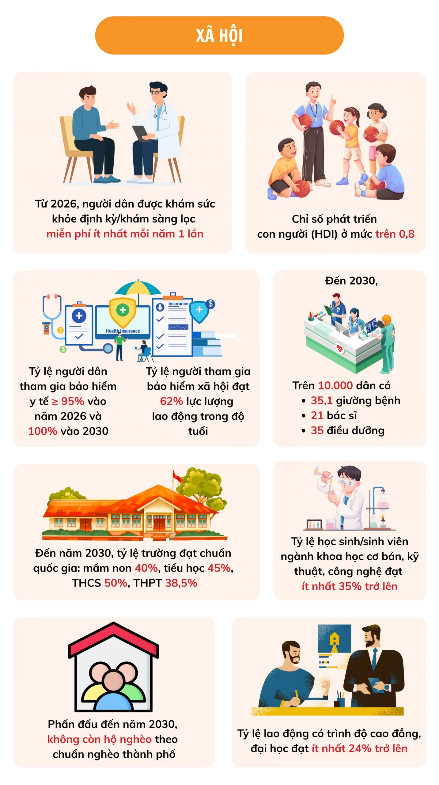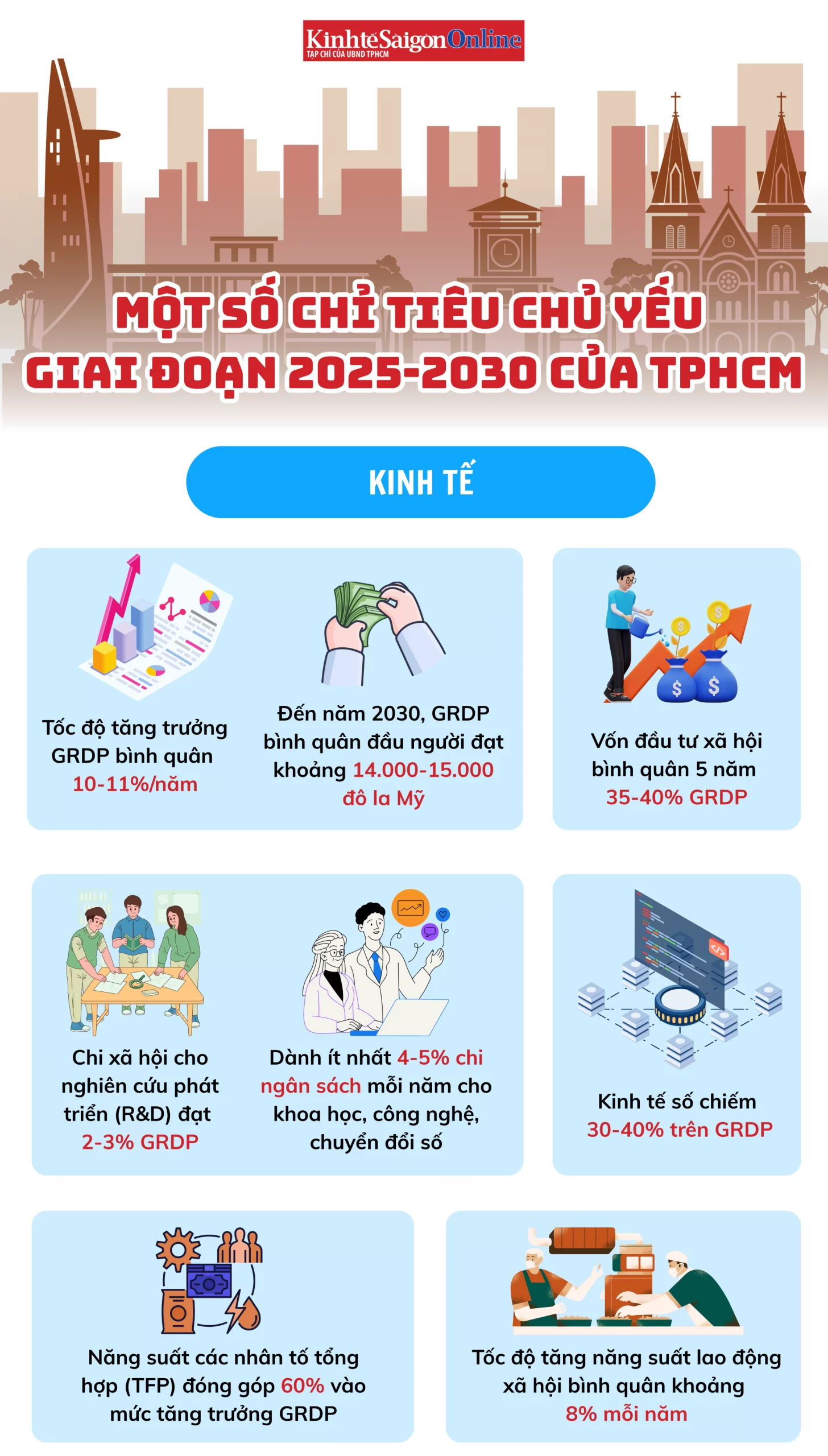 (SGTT) - Theo Nghị quyết Đại hội đại biểu Đảng bộ TPHCM lần I, nhiệm kỳ 2025-2030, thành phố đề ra nhiều chỉ tiêu phát triển, gồm tốc độ tăng trưởng GRDP bình quân 10-11%/năm; đến năm 2030, GRDP bình quân đầu người đạt khoảng 14.000-15.000 đô la Mỹ và chỉ số phát triển con người (HDI) ở mức trên 0,8.