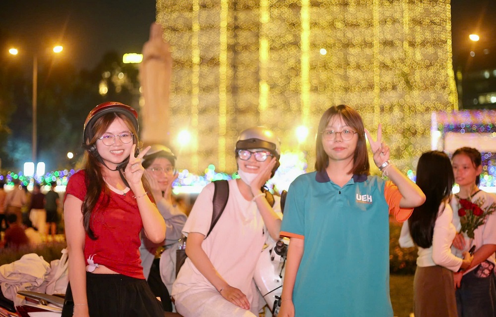 (SGTT) – Cơn mưa trái mùa may mắn đã tạnh vào đúng giờ tan tầm khiến không khí Giáng sinh ở trung tâm TPHCM tối 24-12 vẫn trọn vẹn. Đông đảo người dân ở TPHCM đã đổ về nhiều địa điểm như nhà thờ Đức Bà (phường Sài Gòn), nhà thờ Đồng Tiến (phường Vườn Lài), các trung tâm thương mại... để chụp ảnh, vui chơi đón Giáng sinh.