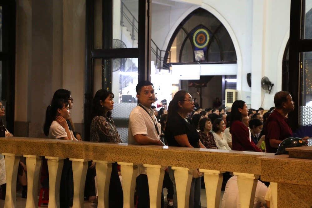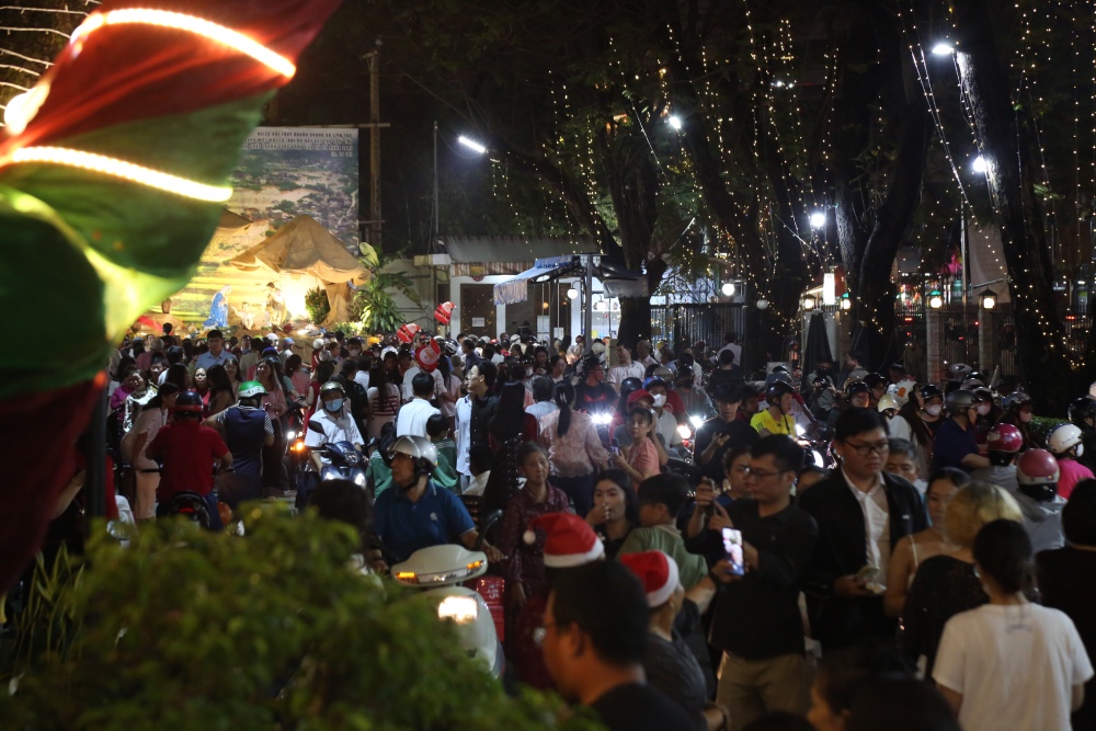 Theo ghi nhận của Kinh tế Sài Gòn Online, từ 18 giờ ngày 24-12, khu vực quanh nhà thờ Đức Bà Sài Gòn đã thu hút đông người dân đến tham quan.Các tuyến đường xung quanh nhà thờ Đức Bà có mật độ người và phương tiện cao. Lực lượng chức năng có mặt từ sớm để điều tiết giao thông.Năm nay, nhà thờ Đức Bà được trang trí bằng hệ thống đèn led với tổng chiều dài khoảng 1.000km, gấp đôi năm ngoái. Đây là năm thứ ba công trình được trang trí đèn Giáng sinh kể từ khi bắt đầu trùng tu vào năm 2017.Trong khuôn viên nhà thờ, đông đảo người dân đến dự lễ, chụp ảnh và đón Giáng sinh.