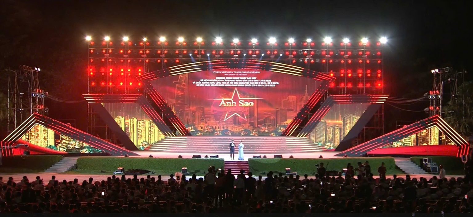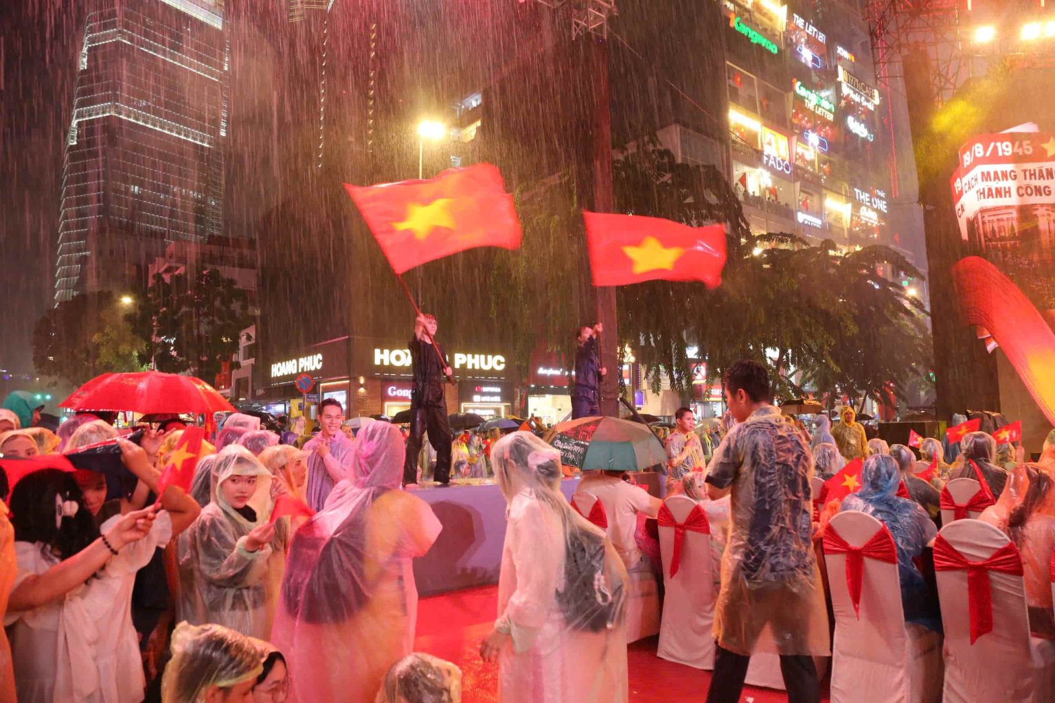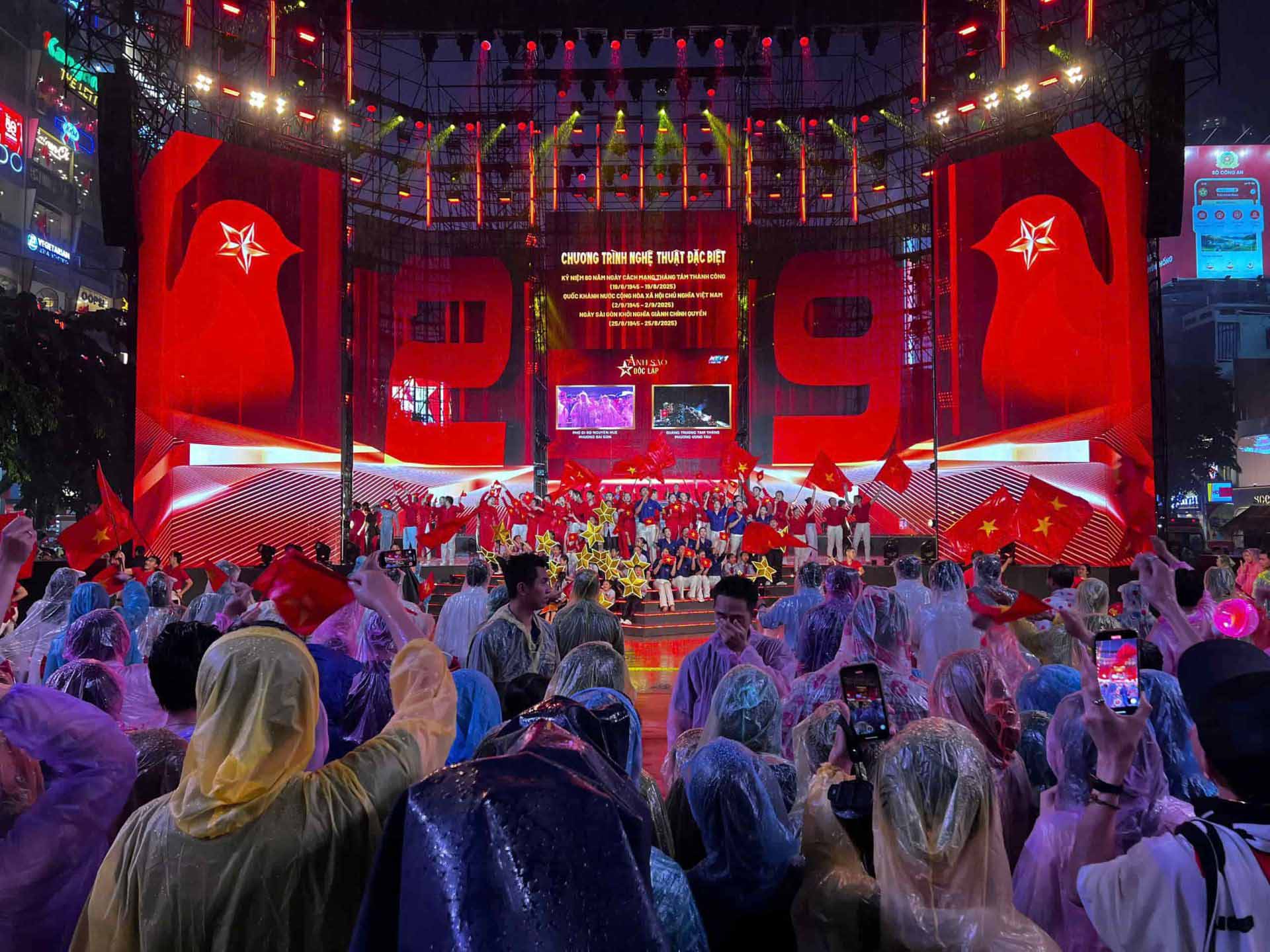 (SGTT) – Tối nay 2-9, tại TPHCM, chương trình nghệ thuật đặc biệt kỷ niệm 80 năm Ngày Cách mạng Tháng Tám và Quốc khánh nước Cộng hòa xã hội chủ nghĩa Việt Nam với tên gọi "Ánh sao độc lập" đã diễn ra đồng thời tại ba điểm cầu là phường Sài Gòn, phường Bình Dương và phường Vũng Tàu. Tại phường Sài Gòn (phố đi bộ Nguyễn Huệ), dù trời mưa lớn kéo dài, các nghệ sĩ vẫn biểu diễn và đông đảo người dân vẫn đội mưa để cổ vũ, theo dõi các tiết mục nghệ thuật.