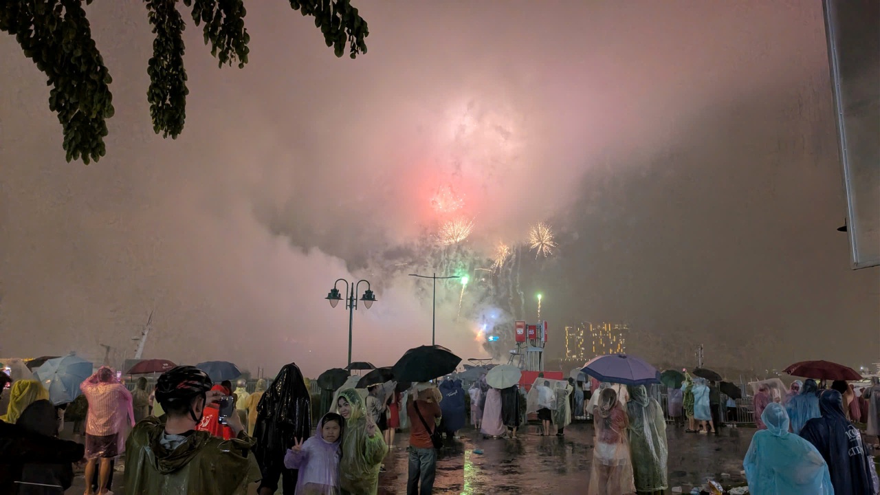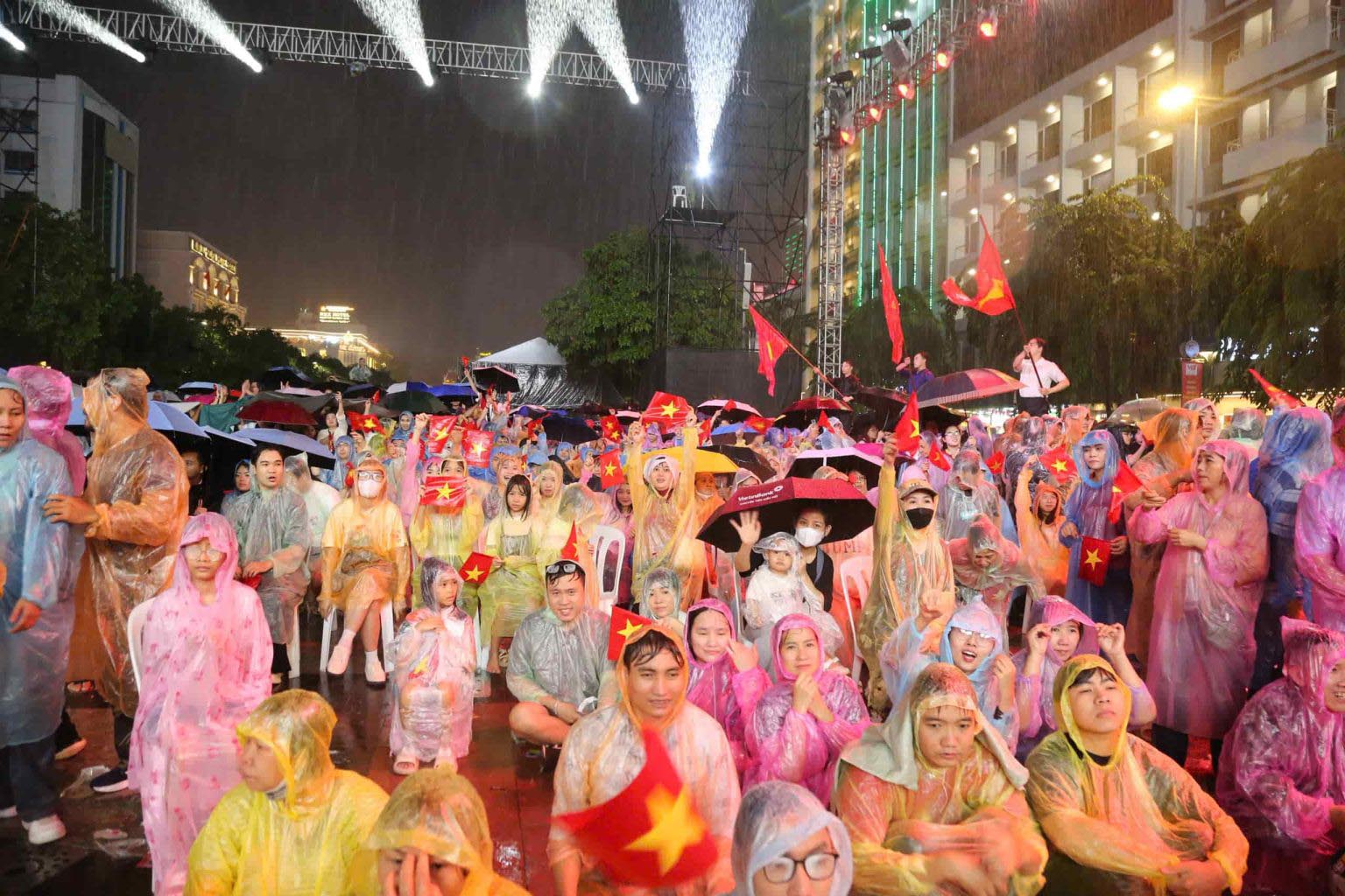 Càng về cuối, mưa mỗi lúc một nặng hạt, nhưng hàng trăm người dân vẫn bất chấp thời tiết để nán lại theo dõi đến hết chương trình.Dưới những chiếc ô và áo mưa, nhiều gia đình, thanh niên, trẻ em vẫn đứng chật kín Phố đi bộ Nguyễn Huệ để thưởng thức các tiết mục nghệ thuật.Không chỉ người dân trong nước, những vị khách nước ngoài cũng đội mưa nán lại và bày tỏ sự thích thú trước không khí vui tươi của chương trình nghệ thuật.Khoác lên tấm áo mưa mỏng, em Nguyễn Ánh Minh (góc phải), học sinh lớp 6 tại TPHCM, vẫn hào hứng cùng những người bạn dõi theo chương trình “Ánh sao độc lập”. “Mưa có hơi lạnh một chút nhưng không ai muốn bỏ về. Đây là lần đầu tiên em được xem trực tiếp một chương trình hoành tráng kết nối cả ba điểm cầu Sài Gòn, Bình Dương và Vũng Tàu. Em cảm nhận rõ không khí đoàn kết, tự hào, như cả nước mình cùng chung một nhịp”, em Minh chia sẻ.Trên sân khấu, các nghệ sĩ vẫn đội mưa biểu diễn hết mình, khiến khán giả dưới khán đài càng thêm xúc động và cổ vũ nồng nhiệt.Sự kiện này do Ban tổ chức kỷ niệm các ngày lễ lớn TPHCM phối hợp Sở Văn hóa và Thể thao TPHCM thực hiện. Chương trình là bản hòa ca của niềm tự hào dân tộc, là dịp để mỗi người dân Việt Nam thêm trân trọng giá trị độc lập, tự do và tiếp nối truyền thống cha ông, cùng nhau xây dựng đất nước phát triển vững mạnh.Trời mưa vẫn không thể ngăn người dân thưởng thức pháo hoa ở khu vực Bến Bạch Đằng (phường Sài Gòn).Người dân đội mưa chụp hình với pháo hoa.