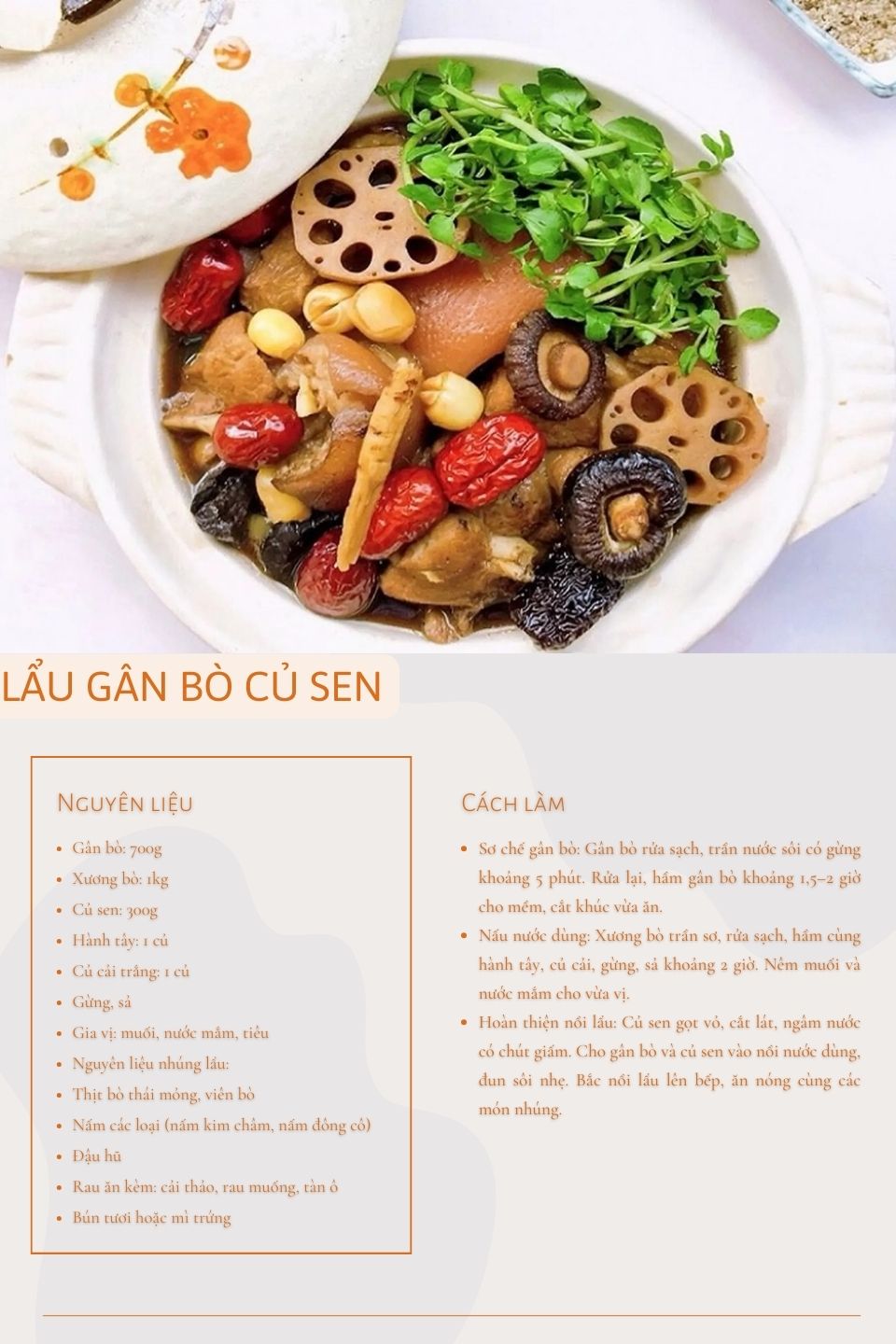 Lẩu gân bò củ sen thường ăn kèm bún tươi hoặc mì trứng. Vị nước lẩu ngọt thanh, không quá đậm giúp món dễ ăn, phù hợp cho những bữa trưa cuối tuần hoặc buổi tối quây quần. Không cầu kỳ nhưng đủ đầy đặn, nồi lẩu này mang lại cảm giác ấm áp, gần gũi, một góc nhỏ quen trong ẩm thực gia đình Việt.
