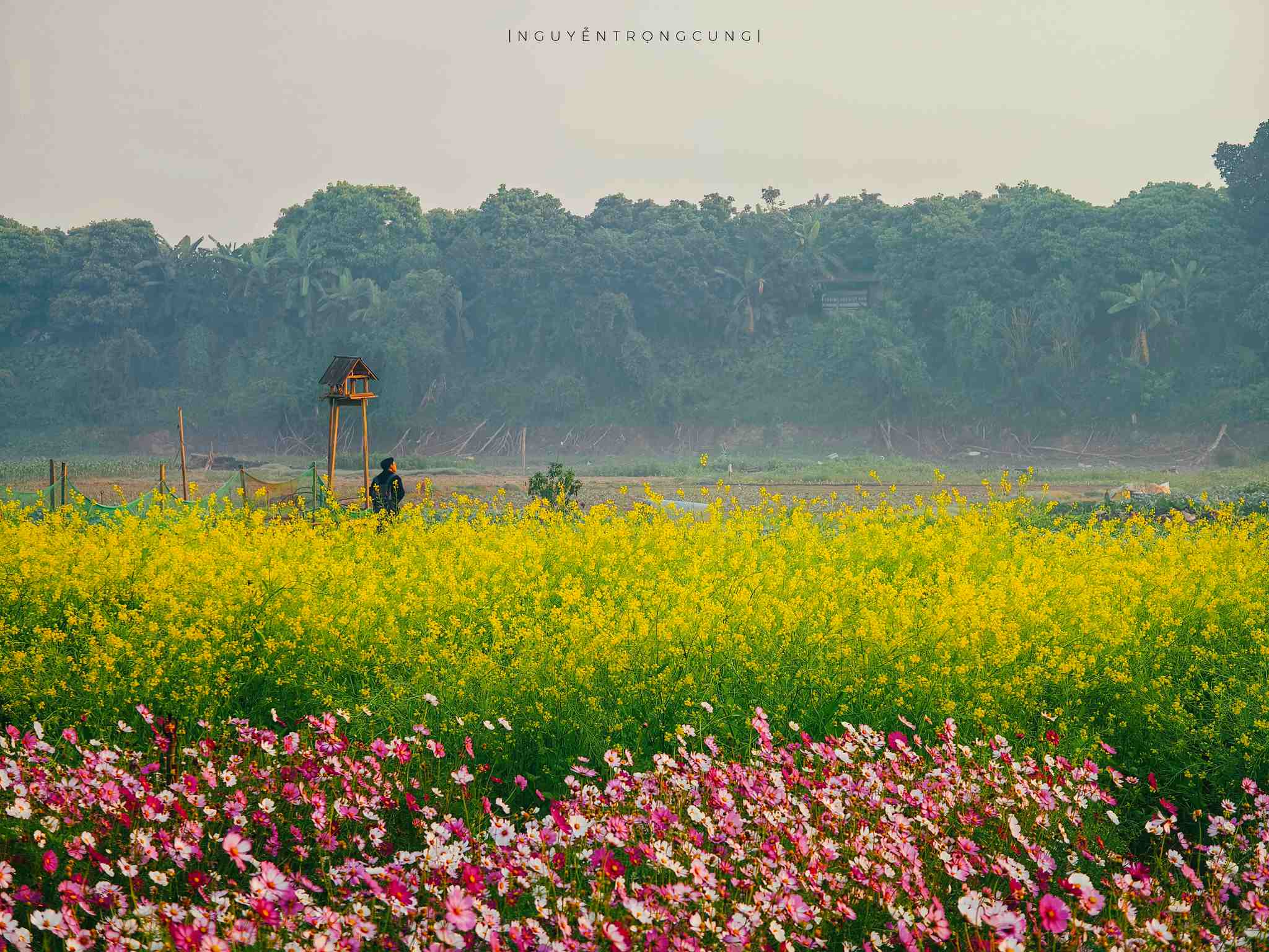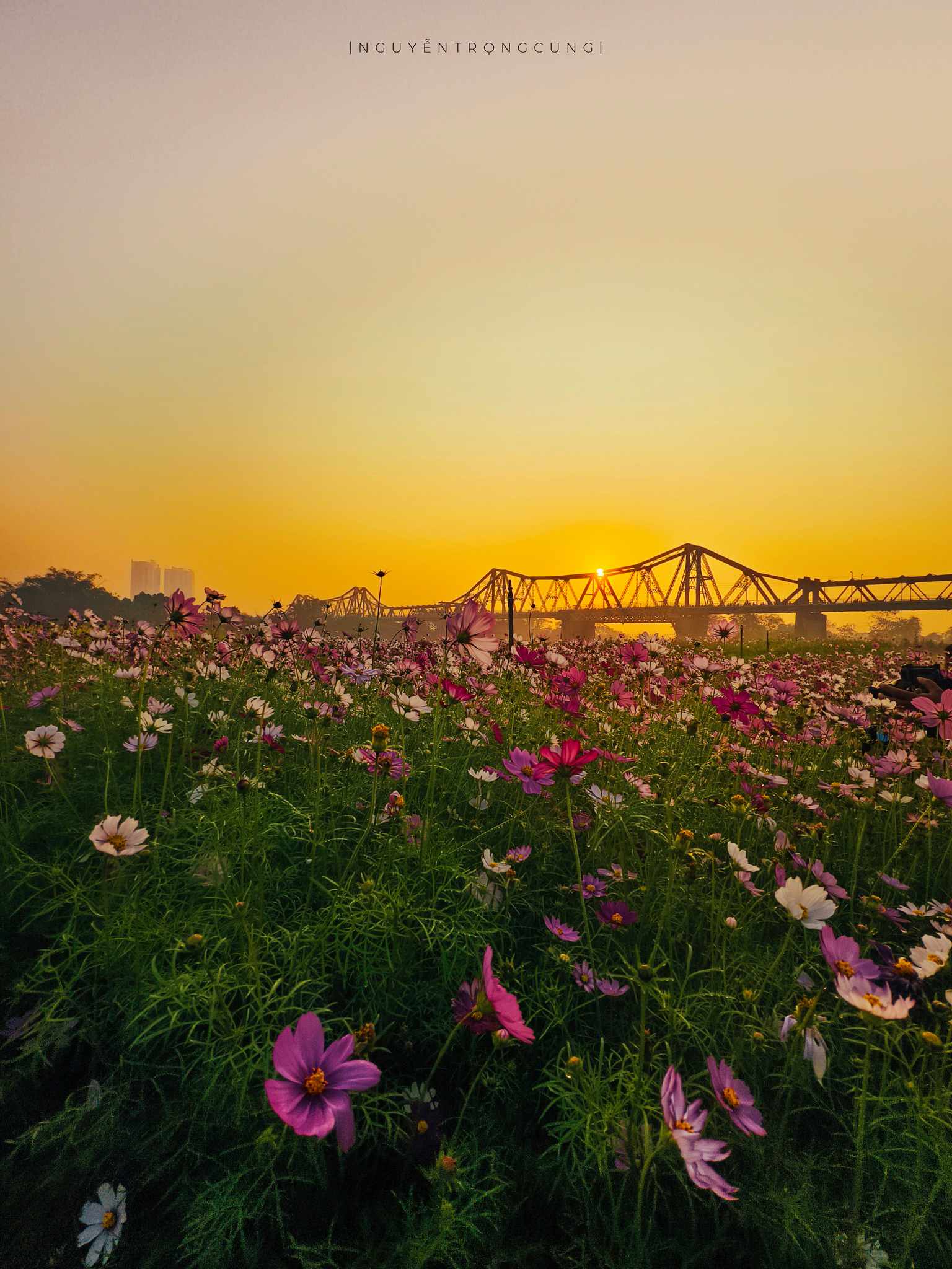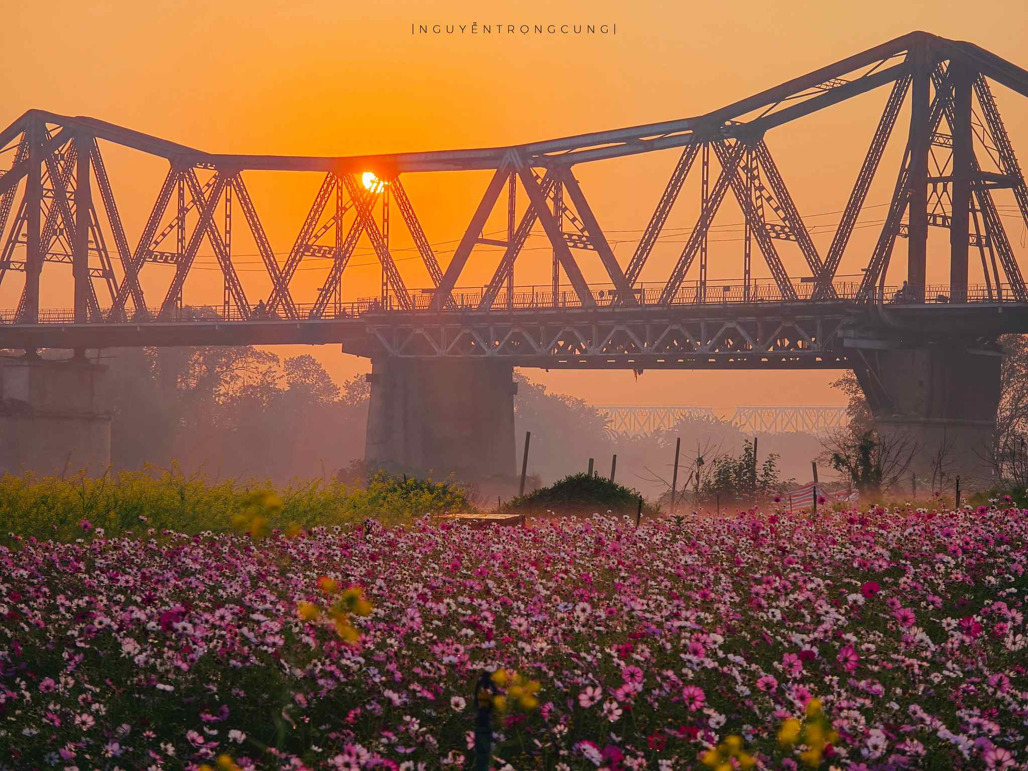 Khu đất ven sông được người dân cải tạo và trồng hàng ngàn cây hoa, hình thành nên những luống hoa trải dài, phủ kín một vùng rộng lớn, mang đến diện mạo tươi mới cho khu vực dưới chân cầu Long Biên. Ảnh: Nguyễn Trọng CungCánh đồng hoa nhanh chóng trở thành địa điểm check-in yêu thích của những người đam mê nhiếp ảnh. Ảnh: Nguyễn Trọng CungVới không gian thoáng đãng, sắc hồng dịu dàng của hoa cánh bướm hòa cùng sắc vàng tươi của hoa cải, phía trên là cây cầu Long Biên cổ kính, nơi đây tạo nên phông nền chụp ảnh vừa lãng mạn vừa đậm chất Hà Nội. Ảnh: Nguyễn Trọng CungHoa cánh bướm (còn gọi là hoa sao nhái) là loài thân thảo, mọc thành bụi, cao khoảng 70–80 cm, cánh hoa mỏng nhẹ, nở quanh năm với nhiều gam màu, trong đó sắc hồng và vàng được trồng phổ biến tại khu vực này. Ảnh: Nguyễn Trọng CungHoa cải vàng cũng nở rộ theo mùa, góp phần tạo nên bức tranh thiên nhiên sinh động, thu hút ánh nhìn. Ảnh: Nguyễn Trọng CungTheo chia sẻ của nhiếp ảnh gia Nguyễn Trọng Cung, khu vực vườn hoa sao nhái tại bến hoa dưới chân cầu Long Biên là địa điểm thuận lợi để chụp ảnh, đặc biệt khi kết hợp với bối cảnh cầu Long Biên trong các bộ ảnh dịp Tết. Ảnh: Nguyễn Trọng CungThời điểm được đánh giá phù hợp để chụp ảnh là từ 5:30 đến 6:30 sáng, khi mặt trời mọc trên các nhịp cầu và thường xuất hiện lớp sương mỏng dưới chân cầu, tạo điều kiện ánh sáng và không khí thuận lợi cho nhiếp ảnh. Ảnh: Nguyễn Trọng CungNhờ được chăm sóc thường xuyên, khu vườn hoa dưới chân cầu Long Biên đang dần trở thành không gian xanh lý tưởng, mang đến điểm dừng chân thư giãn cho người dân và du khách khi ghé thăm Hà Nội. Ảnh: Nguyễn Trọng Cung