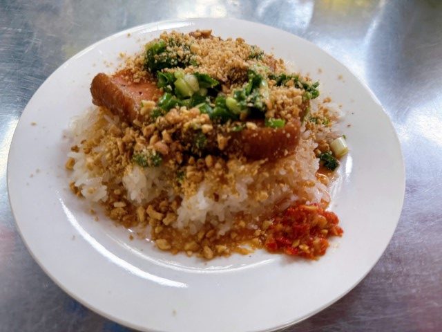 Quay lại đường Võ Văn Tần, đi ngang một khúc đông đông người bán hàng rong, thấy một cái xe để tên Xôi mặn, mừng quá chạy lại nhìn vô xe tìm… lạp xưởng, nhìn kỹ hóa ra thấy một tô lạp xưởng cắt nhỏ, có chút thất vọng nhưng nghĩ giờ đi tìm nữa thì mình có quá cố chấp chăng? Bèn hỏi chị bán xôi tại sao lại không phải lạp xưởng xắt lát mà lại cắt nhỏ. Chị nói cắt nhỏ ăn ngon hơn, tụi nhỏ nó cũng thích cắt nhỏ như vầy, tụi nó đi học nên phải nuốt vội, đâu có thời gian nhai, và người già cũng ưa nữa. Nếu đã vì trẻ em và người già thì tôi còn cố chấp làm gì nữa.